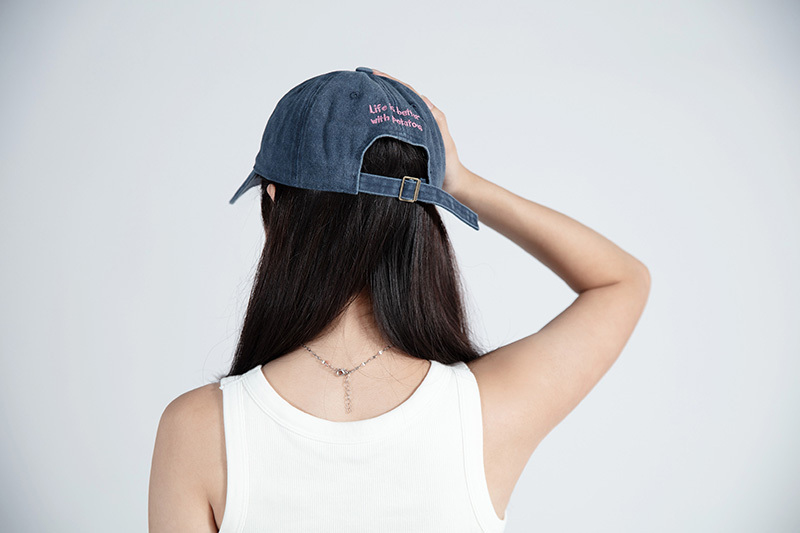 低調水洗藏青色調,搭配立體刺繡字樣
