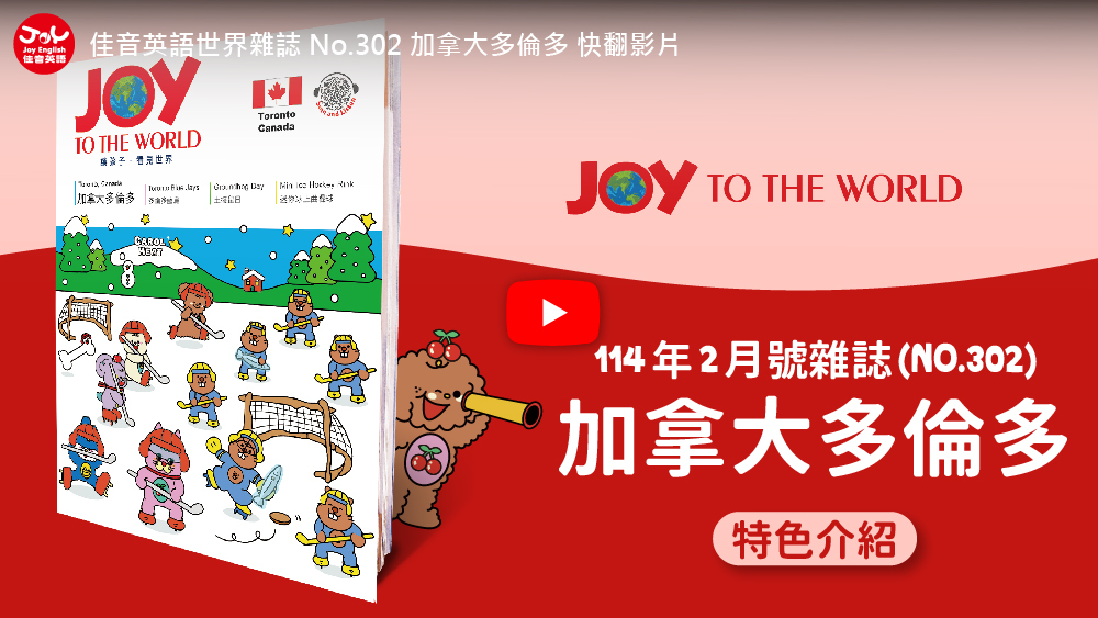 在這期雜誌,我們除了介紹多倫多這個城市的四個景點,還要介紹一種可愛又勤奮工作的動物,河狸,牠們也是本期封面的主角之一唷!緊接著阿嘎會帶著我們去體驗加拿大冬天的娛樂活動,一起滑雪和組隊打冰上曲棍球,以及近距離觀賞尼加拉大瀑布的壯麗景色!喜歡棒球的小朋友們,這一期我們將介紹一支有名的球隊,多倫多藍鳥隊,棒球的小粉絲們千萬不要錯過了喔!讓我們翻開第一頁,進入加拿大冬季冰天雪地的世界吧!