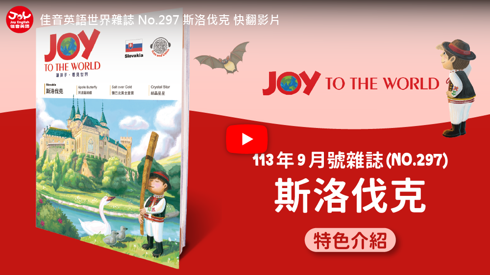 我們這次探索一個位於中歐的國家,斯洛伐克。你可能不太熟悉這個國家,但你一定聽過睡美人的故事!出現在封面的美麗建築物,叫做「波耶尼切城堡」(Bojnice castle),優美的造型,就像是童話故事中睡美人的家,因此有許多人稱呼它為斯洛伐克最美的城堡!主角約瑟夫穿著斯洛伐克的傳統服飾,布料上的花紋是精緻的手工刺繡。他吹奏的巨大樂器,叫做富亞拉笛(fujara),在過去,是山區的牧羊人溝通使用的樂器。