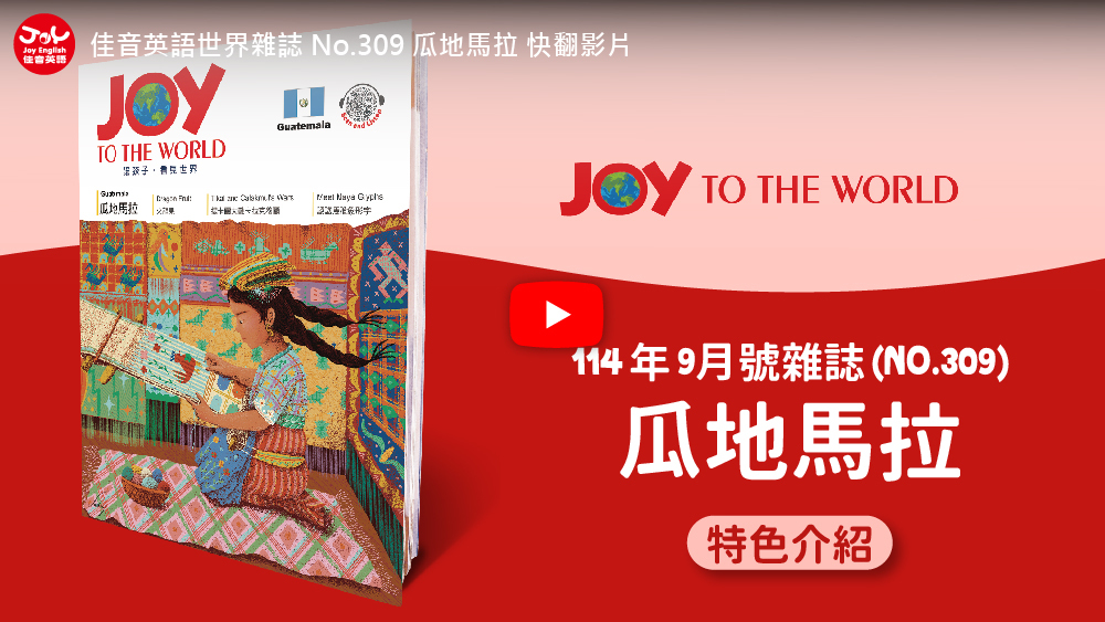 小朋友們,你們知道中美洲有一個美麗的國家,不但擁有三十幾座火山,還是馬雅文明的起源地之一嗎?在這一期雜誌,我們要一起前往瓜地馬拉,一個充滿自然景觀與神秘傳說的國家。封面主角瑪麗亞正在用一種流傳千年的古老方式織布。首先將織具一端綁在柱子或樹幹上,另一端則用腰帶繫在腰上,慢慢編織出色彩鮮艷、圖案細緻的織布,展現馬雅文明流傳至今的技藝與美感。