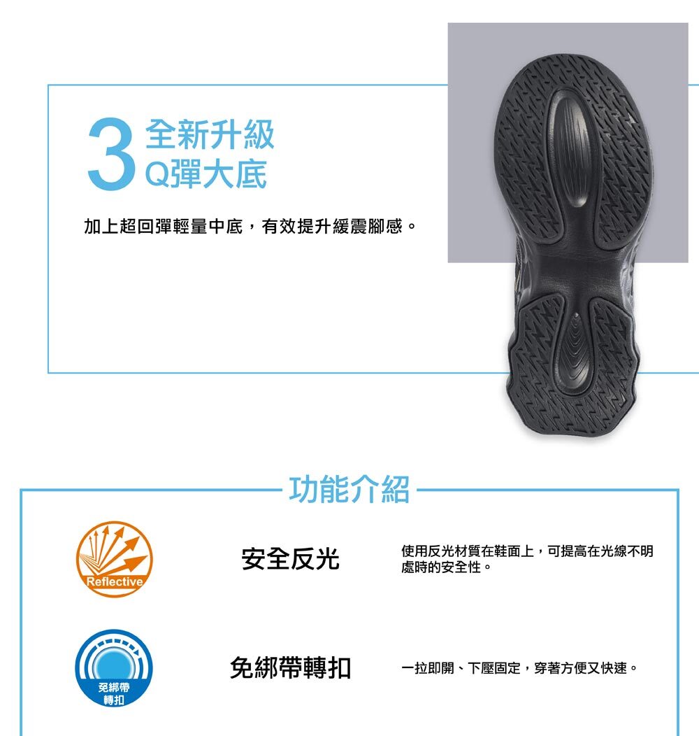 鞋舌與後跟設有反光織帶增加辨識度,有效提升夜間運動的安全性