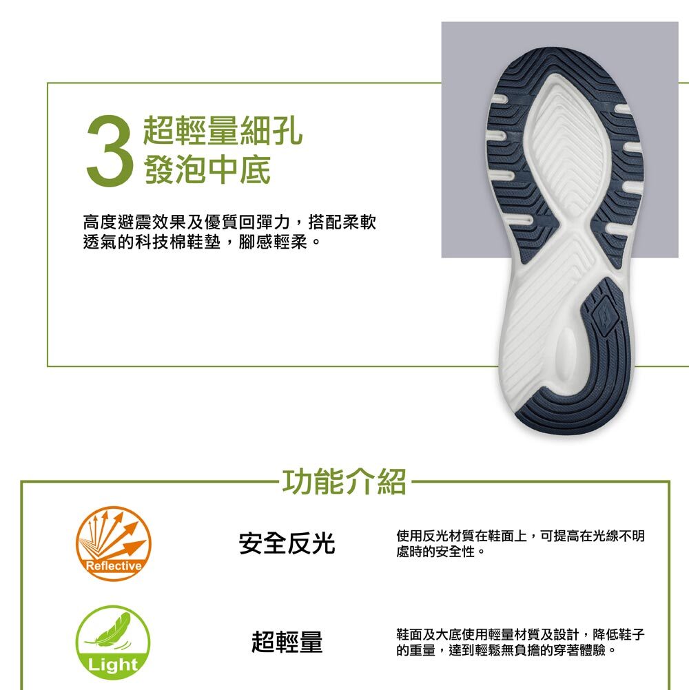 超輕量細孔發泡中底,提供更高度避震效果及優質回彈力,搭配柔軟透氣的科技棉鞋墊,腳感輕柔,有效釋壓緩震、減輕疲勞,運動步行舒適感受大升級