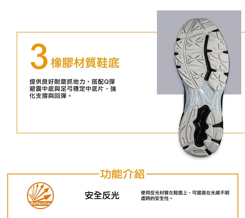 寬楦設計,適合台灣人腳型,加上鞋頭、鞋舌與後跟反光細節,提升夜間安全性