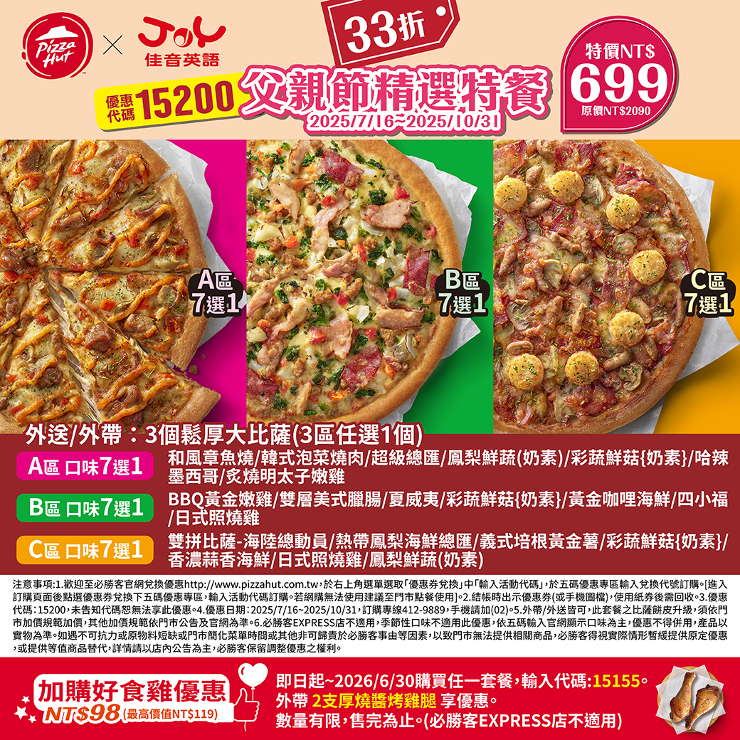 3個鬆厚大比薩(3區任選1個)=特價NT$699(原價NT$2090)、A區 (口味7選1):和風章魚燒/韓式泡菜燒肉/超級總匯/鳳梨鮮蔬(奶素)/彩蔬鮮菇{奶素}/哈辣墨西哥/炙燒明太子嫩雞、B區 (口味7選1):BBQ黃金嫩雞/雙層美式臘腸/夏威夷/彩蔬鮮菇{奶素}/黃金咖哩海鮮/四小福/日式照燒雞
