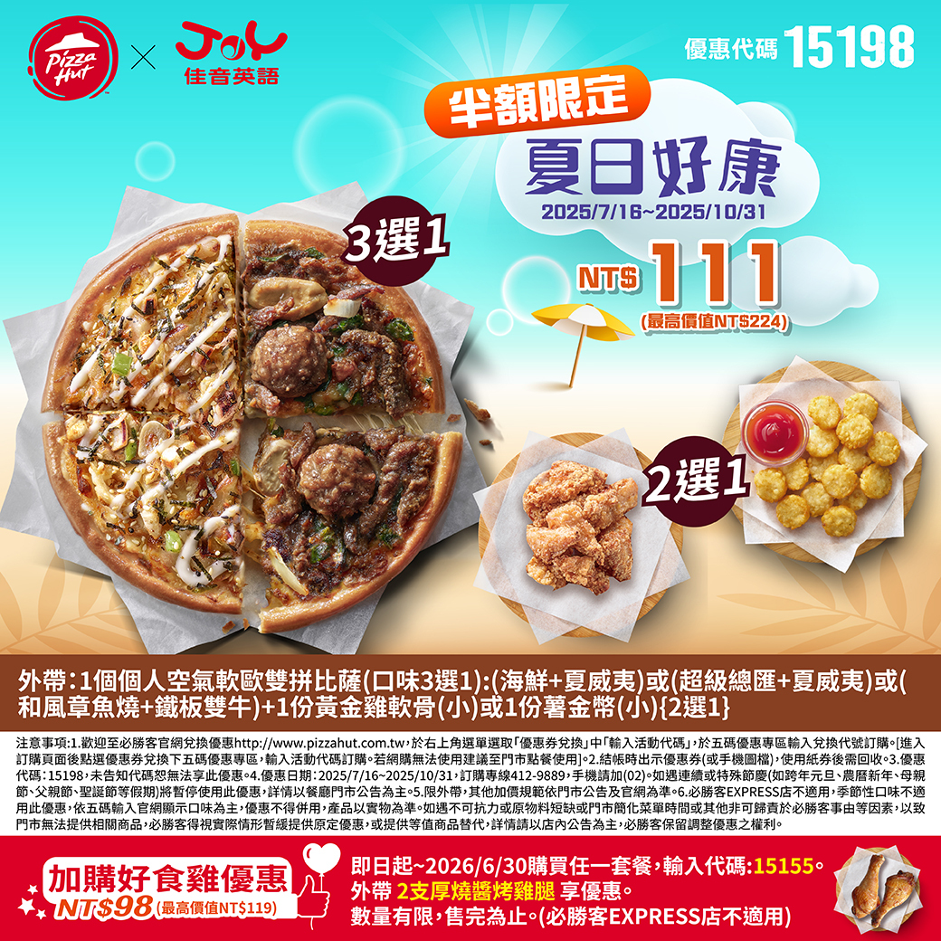 1個個人空氣軟歐雙拼比薩(口味3選1):(海鮮+夏威夷)或(超級總匯+夏威夷)或(和風章魚燒+鐵板雙牛)+1份黃金雞軟骨(小)或1份薯金幣(小){2選1}=NT$111(最高價值NT$224)