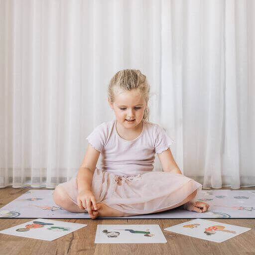 使用兒童瑜珈組隨時隨地練習正念,其中包括寶貝的瑜伽墊和精美的瑜伽插畫圖卡。