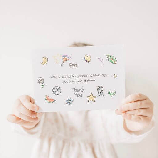 手寫的卡片或感謝信是表達感激之情的最衷心和最有意義的方式之一。 教你的孩子抽出時間去思考他們感激的事情和人是練習正念的好方法。 每個感恩郵件套件包含 12 張 Mindful & Co Kids 獨有的獨特卡片,一張給老師,一張給其他人。